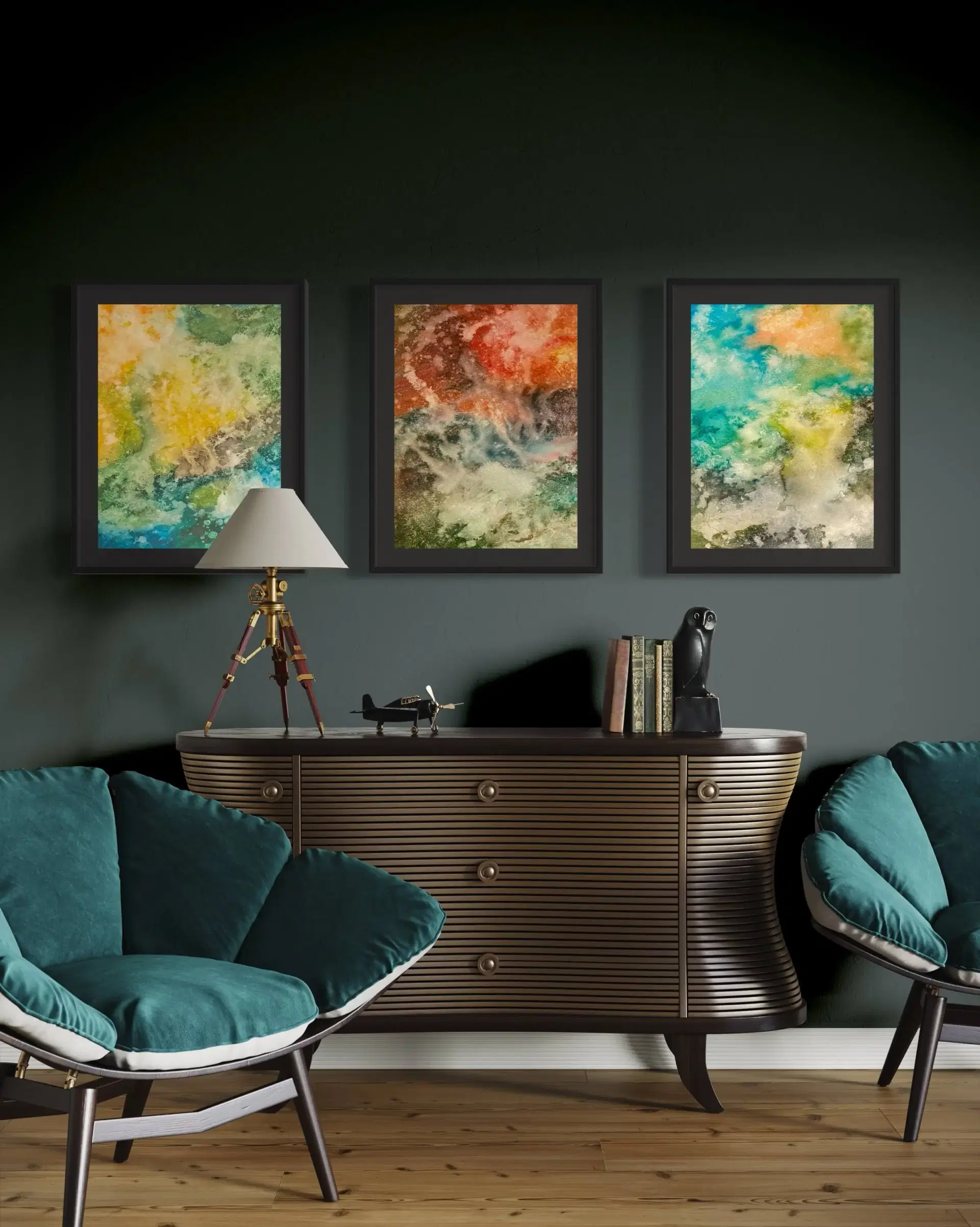 Präsentation des Gemäldes in beispielhaften modernen Innenräumen.